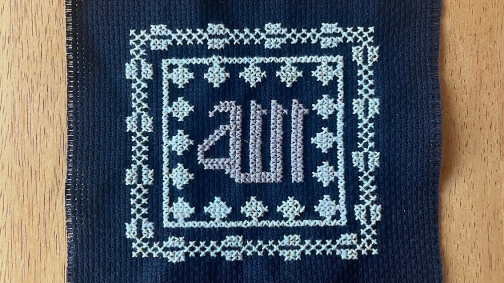 Engage in the meditative practice of embroidery while reflecting on the name of Allah with this tatreez (cross-stitch) pattern featuring the name of God in Arabic calligraphy surrounded by two traditional Palestinian border motifs ("nafnoof").