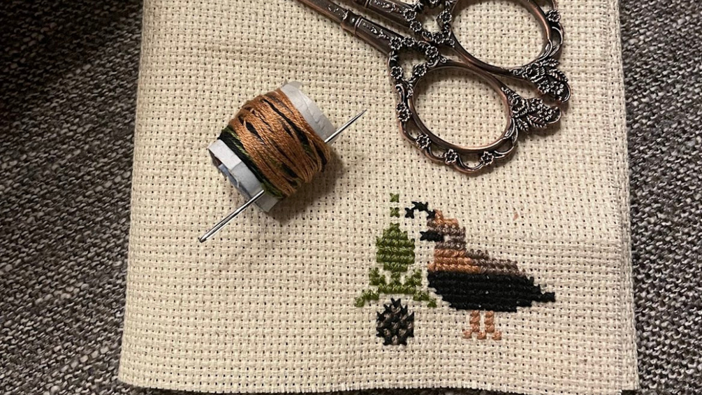 Stitch this original motif inspired by the Gambel's Quail I see running back and forth outside of my window. The design builds off of traditional bird motifs from Palestine.